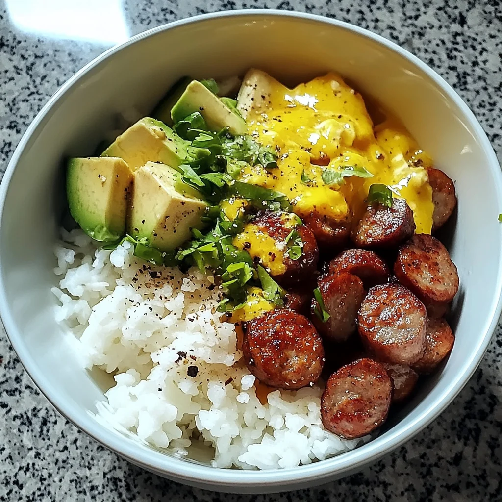 A warm, hearty breakfast bowl featuring savory chicken sausage, creamy scrambled eggs, fluffy rice, and fresh avocado—ready in under 15 minutes for a quick morning boost.