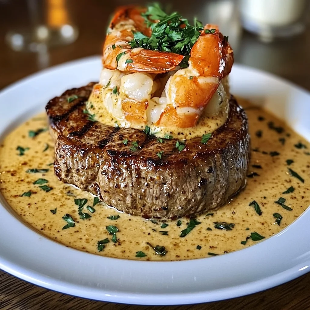 - Step 5: Plate steaks and top with Cajun shrimp. Spoon creamy sauce over everything. Garnish with fresh parsley and serve immediately.