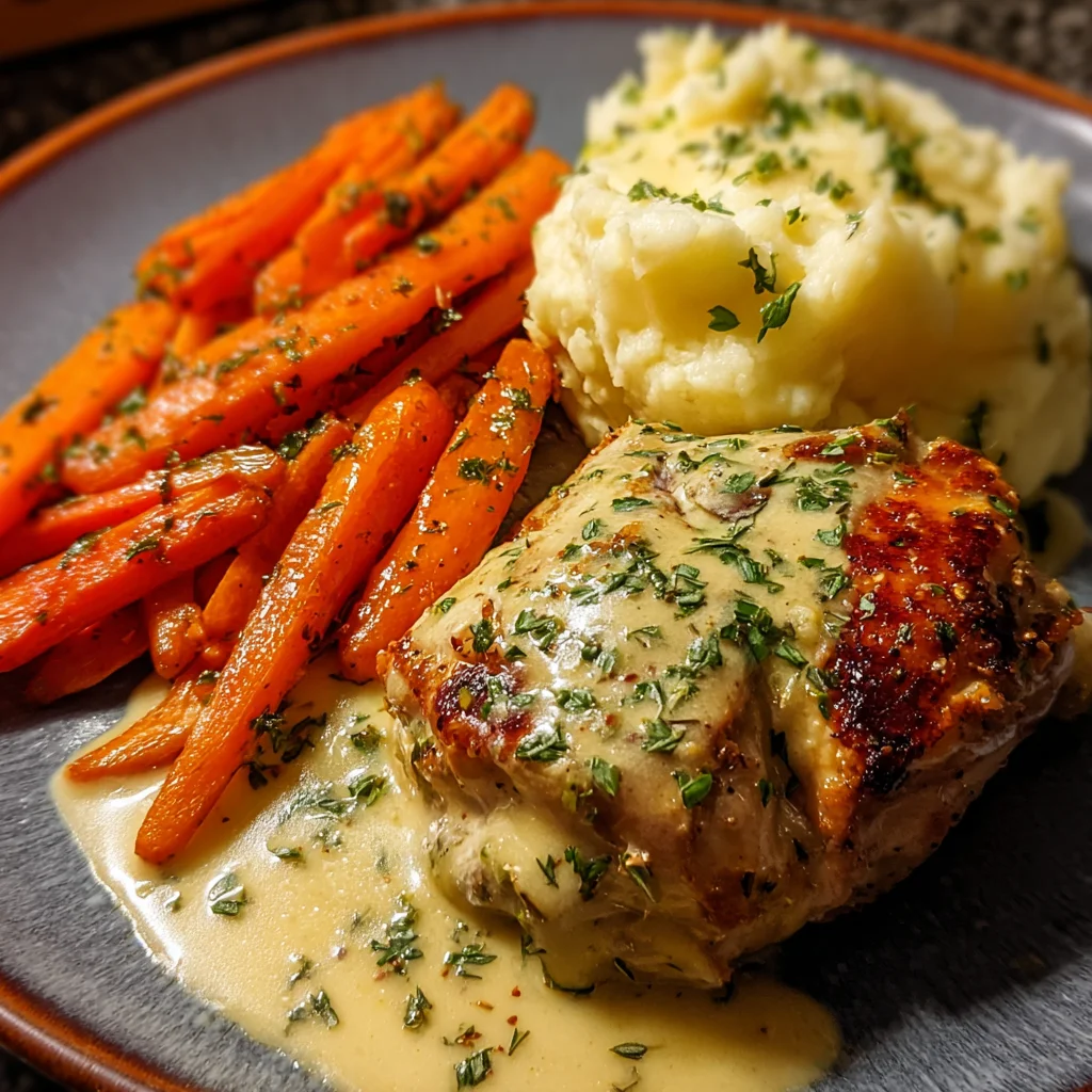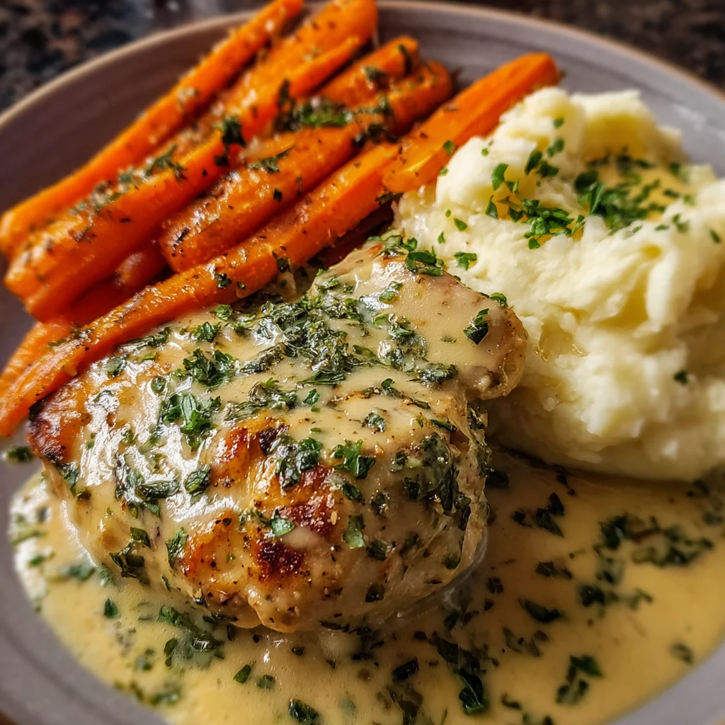 - Serve and garnish: Plate the chicken topped with that dreamy sauce, alongside a generous scoop of mashed potatoes and the sweet roasted carrots. Sprinkle a little extra chopped parsley on top for a fresh, colorful finish.